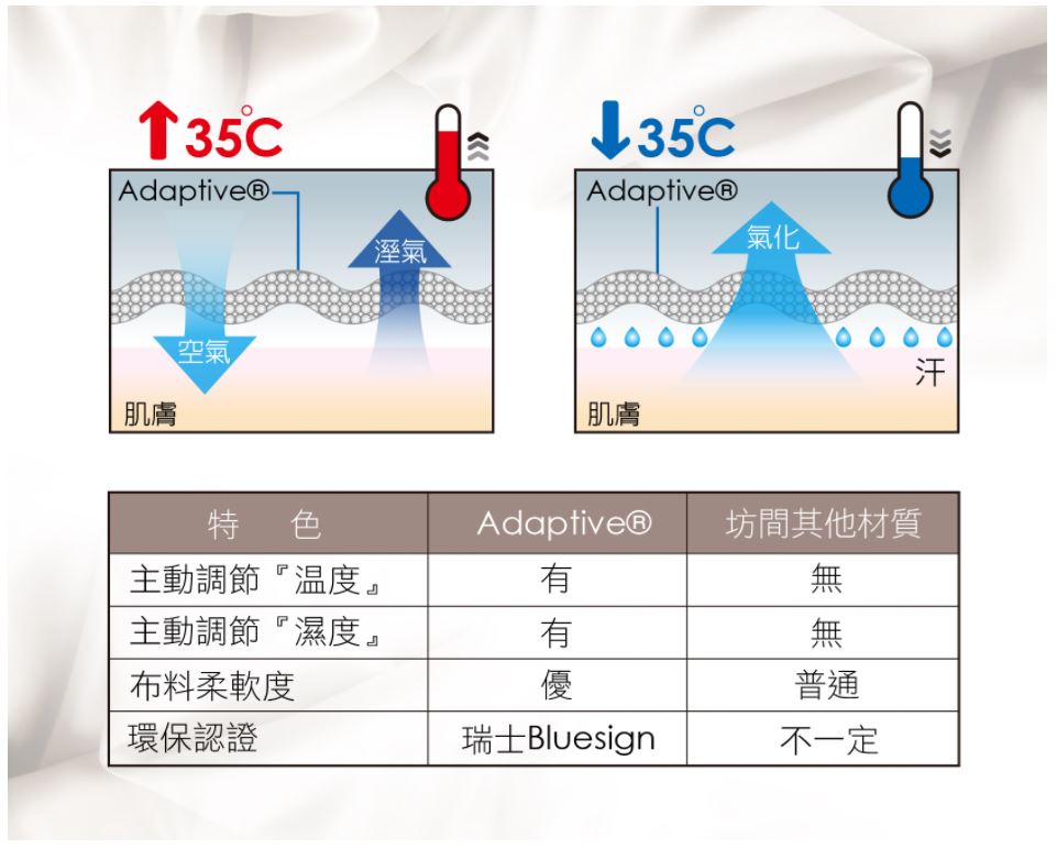 另外,新科技機能布料的功能很多,像比利時大廠 Bekaert Deslee創新研發的機能布料Adaptive®,是以温度35度為驅動纖維張開或閉合的關鍵點。所以當體表温度超過35度時,纖維會張開,讓熱氣散出。若温度低於35度時,纖維會閉合,將體温留下,身體不受寒。冬暖夏涼的設計,是最適合這多變的春天季節。